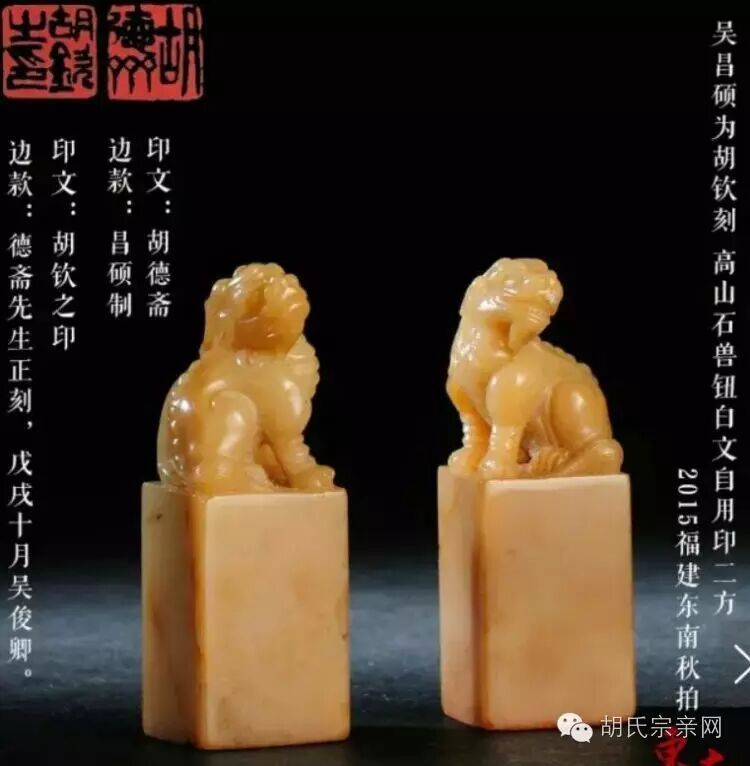 这对"寿山石"之印,是吴昌硕为我曾祖父胡钦(德斋)所篆刻。遗憾的是在网上看见,谁送拍的呢?!会否失联的伯父胡观洛的后代?!胡观洛清末民初曾在江西安远任知事以及行政署任职,后经商去新加坡,香港;其长子胡赓渔,其女儿嫁与赣州稽家。