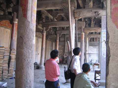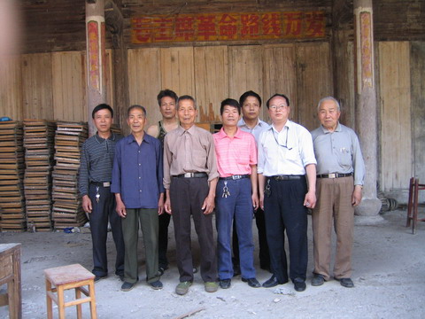 尚湖胡氏世系记载也是一清二楚:彭公--彦濲--承师--则--淮--覃( 拼音:qín)--隅--咸--德祖--卜年--序起(尚湖始迁祖),旧谱基本完整(1940年修),世系也很清楚。而且村里的胡氏宗祠原址保存完好,村干部们打开宗祠大门,我们看到可能是建于明朝中后期的这座宗祠内部还是有一定规模的,古戏台、回廊、石柱、雕梁旧貌尚存。据说前厅正中还有一幅先祖胡则画像,文革时被搞掉了。我回上海后,在金华电视台工作的胡法林宗亲发来短信说古戏台是清嘉庆甲戊(1814年)所建。宗祠内两株百年桂树依然维持着它们顽强的生命力,每逢八月金秋,这两株“金桂、银桂”发出的阵阵香气,弥漫于整个村庄,沁人心脾。由于远离都市,这个村子独具田园风光,加上宗祠里这两株古桂花树,以及胡则大帝嫡系子孙这些人文资源,我建议他们可以考虑以修复宗祠为契机,开发旅游资源,从而改变村里经济落后的现状。村干部们也表示要重视宗祠修复这件事,敬宗耀祖,为民谋福。我们在宗祠里合影留念,背景还是上世纪文革期间的红色标语。上胡村现有村民400余户,1400多人,基本上都姓胡。由于经济状况等原因,上胡村已经好久没有参与永康胡氏族务活动了。但他们的确是永康胡氏中著名的一支,胡则大帝之后人,香火绵延近千年,在义乌的这个小村庄,仍然还像宗祠里那两株桂树一样,枝繁叶茂。